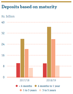 Our deposit base comprises fixed and savings deposits including Islamic deposits mobilised by the Company. Consequent to the shift in funding strategy from reliance on bank borrowings to promoting deposits, our deposit base recorded a robust growth since last financial year permitting us to own the second largest deposit base in the NBFI sector. Total deposit base notched Rs. 88,368.66 million with an increment of 26.67% over the deposit base as at 31 March 2018. With this improvement, deposits now represent 64.54% of our borrowing mix in comparison to 55.60% in last year. However, the Company still encounters with the difficulty in finding deposits with a longer maturity to match with our long-term lending portfolio since the deposit base is more skewed towards maturities between six to twelve months.